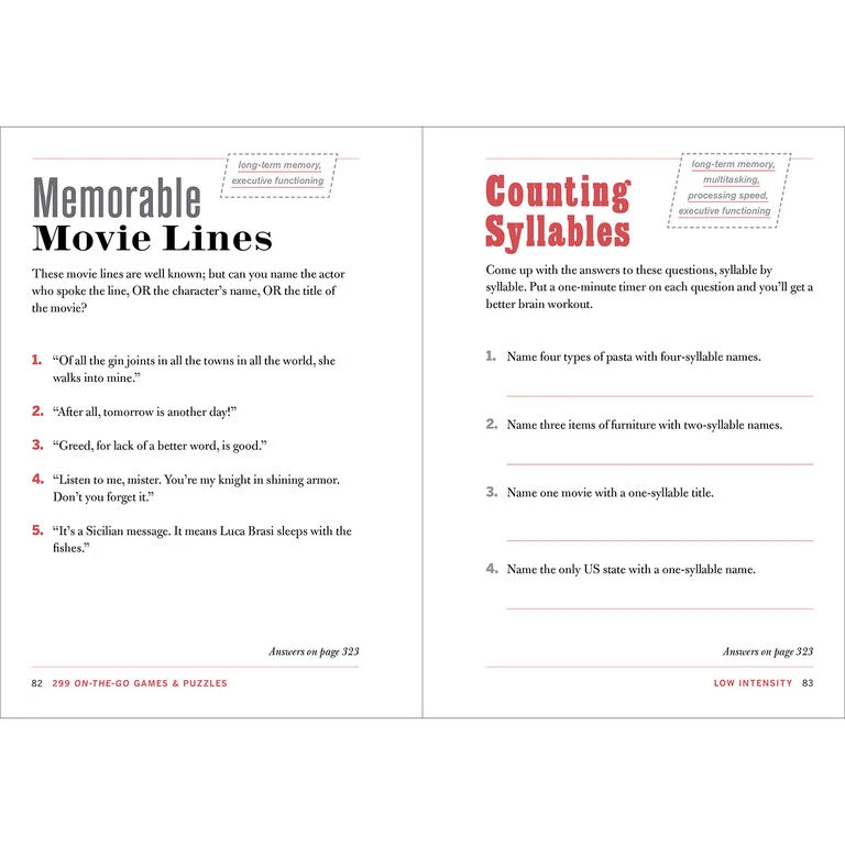 Keep your mental fitness game strong, even on-the-go, with a book of challenging puzzles and games. This portable-sized paperback of 299 puzzles is arranged in difficulty from “Easy Does It” to “Finish Strong,” with puzzles that help you sharpen six key cognitive functions:
