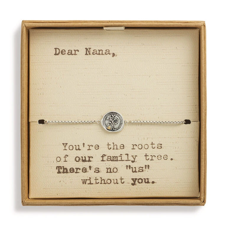 Celebrate nana, the heart of the family, with this sweet silver-finished bracelet featuring a round charm with embossed tree and a gold heart at its base. Eye-catching charm is shaped like a wax seal, reminiscent of the anticipation and pleasure of receiving a thoughtful letter. Gift box packaging includes a loving, letter-style message for nana. She’ll treasure this reminder of the loving family she has dedicated her life to nurturing.