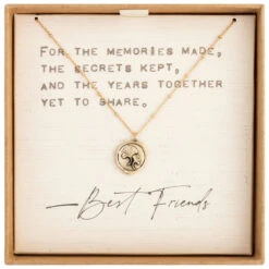 A bond of true friendship is too special to overlook. Celebrate it with this brass necklace that features two embossed floral blooms on a round charm resembling a wax seal—a nostalgic reminder of the anticipation and pleasure of receiving a letter from someone special. Gift-box packaging includes a letter-style sentiment that reminds your best friend how much you treasure the connection you share.