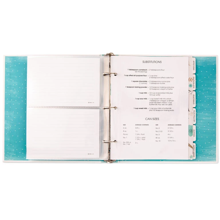 - Includes 20 double-pocket poly-sleeve pages with space to hold up to 80 4×6 recipe cards, 1 top-loading pocket page, 40 designed recipe cards, 10 designed tab dividers and 5 pages of cooking references.
