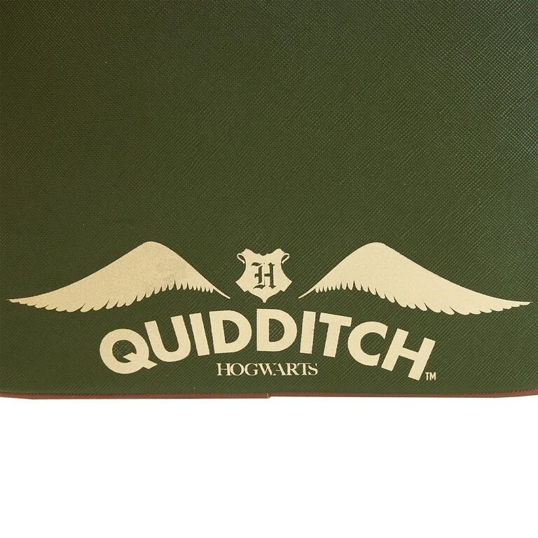 Fly through errand days and add a dash of magical charm to your wardrobe with this brown and olive green Harry Potter mini backpack with a Golden Snitch front pocket. The faux leather bag with a printed Quidditch field design features debossed and appliquéd details and a round Snitch pocket complete with wing attachments. The bag is a perfect accessory for any young witch or wizard’s school uniform, or just an enchanting everyday bag to carry all your necessities.
