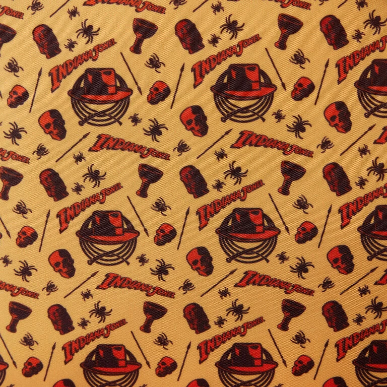 - Loungefly faux leather weathered brown miniature backpack features Indiana Jones design with printed boulder and cave scene with coordinating interior lining.