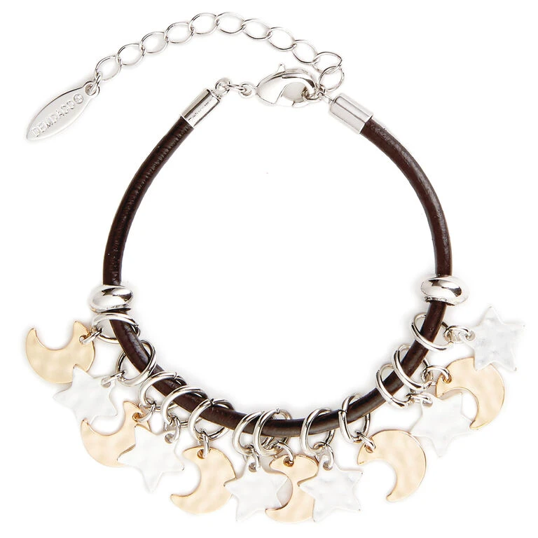 - Leather bracelet with metal moon and star charms and lobster clasp closure.