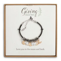 Remind a special someone or friend that you love them to the moon and back with this pretty charm bracelet. This thoughtful gift features gold-toned crescent moons and silver-toned stars of hammered metal dangling from a leather cord. This pretty bracelet is easy to wear with a lobster clasp closure and size-to-fit chain. It makes a heartfelt gift for any occasion in easy, ready-to-gift packaging.