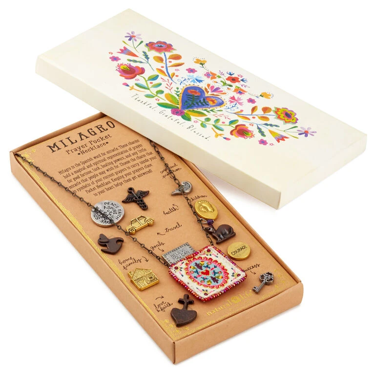 - Natural Life Milagro prayer pocket necklace features embroidered pocket to hold prayer charms.