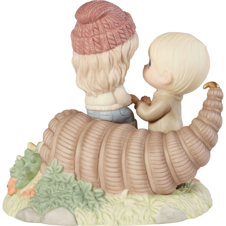 - Precious Moments figurine with hand-painted details features a boy and girl couple standing at a cornucopia brimming with bounty.