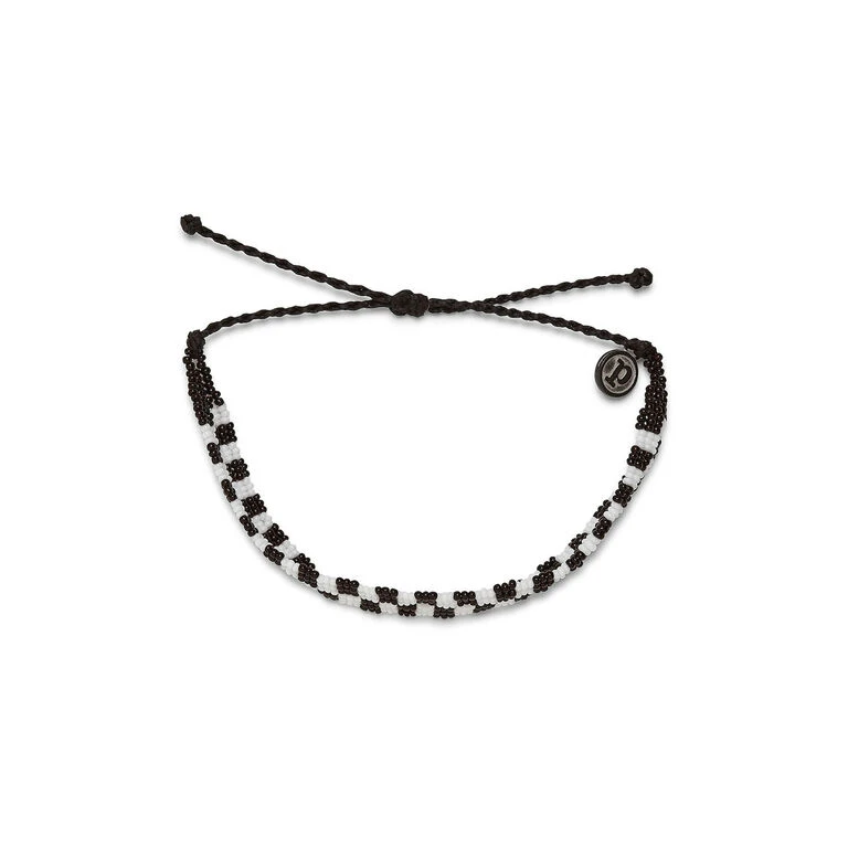 - Pura Vida bracelet features black and white seed beads in a checkerboard pattern.