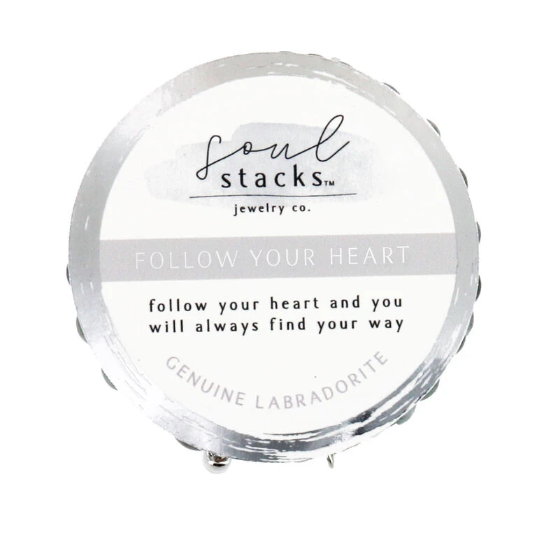 Find your way in life with an inspirational piece of jewelry to help keep you focused on what’s important. This set of three stretch bracelets is made with genuine labradorite stones and exceptional silver metal beading featuring subtle tassel and charm accents that coordinate with its message on a silver bar. Encourage yourself, a friend or loved one to follow their heart with this quality jewelry for their birthday or new adventure.