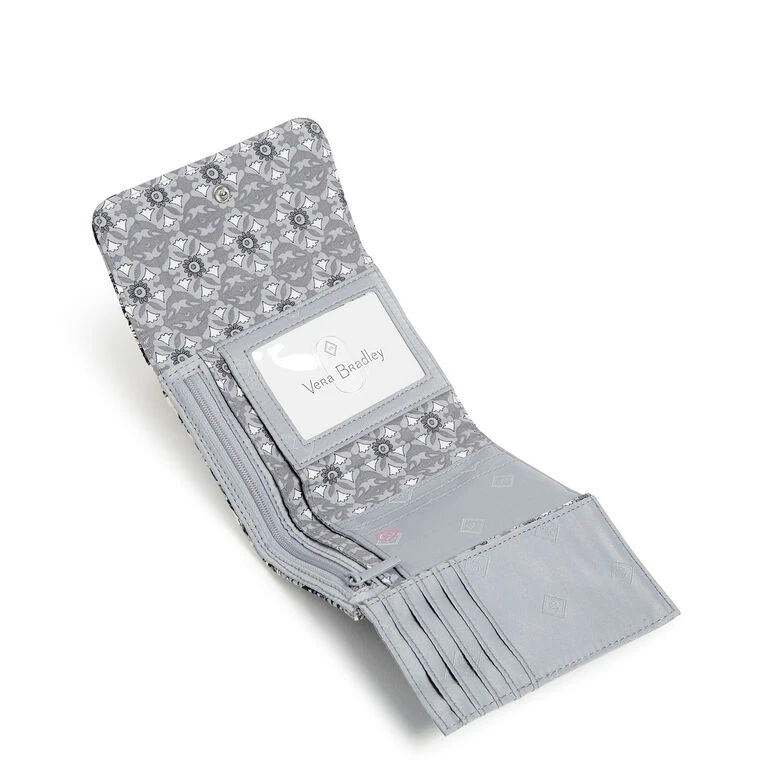 This small but hardworking Vera Bradley wallet keeps your life organized with plenty of interior slips for cash, cards, coins and ID, and two snap closures. Smart technology with worry-free, RFID-blocking liner protects your credit and debit cards from unwanted scans. And it’s as pretty as it is practical in gray with black medallions pattern made of quilted, recycled cotton fabric.