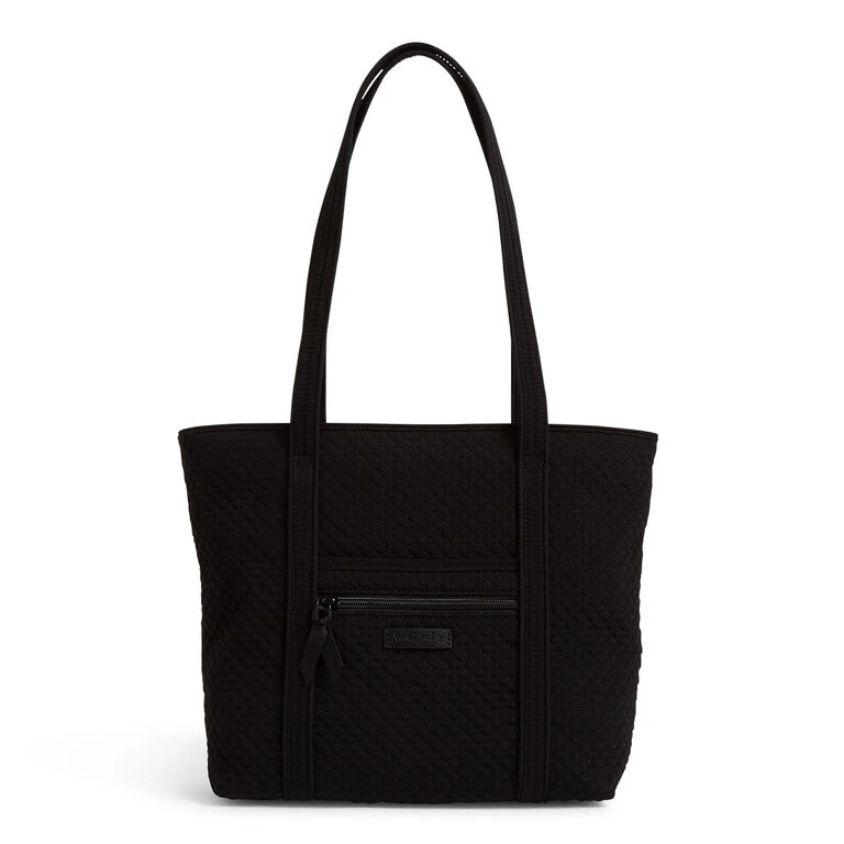 Lots of pockets inside and out make this timeless tote from Vera Bradley a must-have for any woman. Pack it full of your go-to essentials to get you through the day in comfort and class. The small handbag is made of lightweight microfiber fabric in classic black with a patterned lining for a winning combination of style and functionality.
